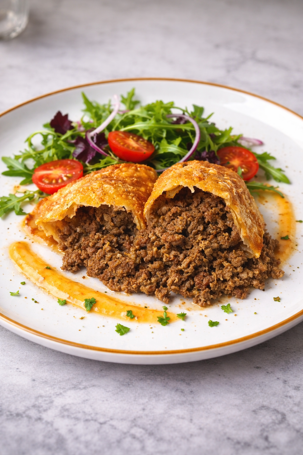 A savory classic filled with seasoned ground beef marinated in a flavorful blend of herbs and spices, slowly cooked to perfection for a rich, hearty taste